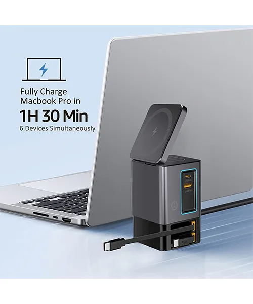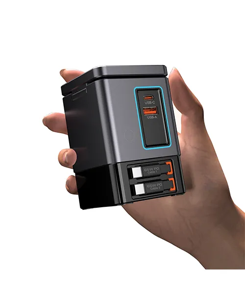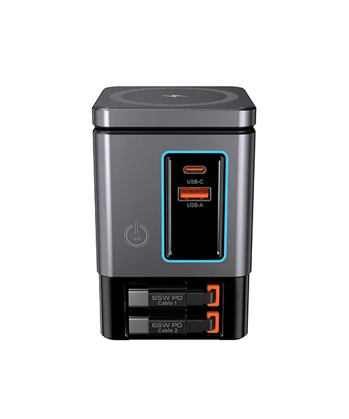 Двата вградени прибиращи се USB C кабела с мощност 65W Ви освобождават от нуждата да носите допълнителни кабели. Те винаги са на мястото си и правят зареждането лесно и подредено.